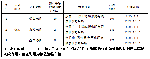 盈江海螺擬對云西片區(qū)2022年度水目山站原煤短倒運輸進行公開招標,選定中標單位,現(xiàn)將相關(guān)事宜公示如下: