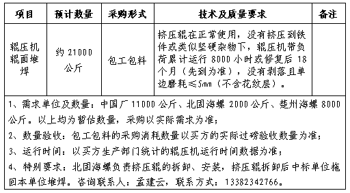 1、標(biāo)的內(nèi)容:輥壓機(jī)耐磨焊絲堆焊包工包料項(xiàng)目;