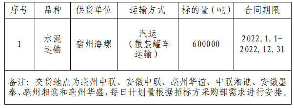 為做好2022年度宿州海螺水泥有限責(zé)任公司(以下簡稱:宿州海螺)至安徽墨泰、安徽中聯(lián)、亳州華誼、亳州湘譙、亳州中聯(lián)、中聯(lián)湘譙和亳州華盛水泥運輸招標(biāo)工作,由安徽海螺綠色新材料有限公司采購部牽頭,對宿州海螺水泥運輸進行公開招標(biāo),特將本次招投標(biāo)的有關(guān)事宜公告如下: