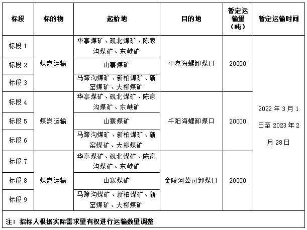 現(xiàn)對(duì)平?jīng)龊B?、千陽海螺和金陵河公?022年華亭煤炭運(yùn)輸組織公開招標(biāo),為進(jìn)一步體現(xiàn)公平、公正、公開透明的原則,現(xiàn)將招標(biāo)信息發(fā)布如下: