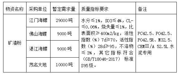 按照廣東區(qū)域供應(yīng)專業(yè)組2022年招標(biāo)計(jì)劃安排,安徽海螺水泥股份有限公司廣東區(qū)域下屬的江門海螺、佛山海螺、湛江海螺、茂名大地四家公司擬對(duì)2022年2季度礦渣粉采購(gòu)進(jìn)行聯(lián)合公開招標(biāo),為進(jìn)一步體現(xiàn)公平、公正、公開的原則,拓寬采購(gòu)渠道,提高采購(gòu)質(zhì)量,現(xiàn)將相關(guān)事宜公告如下: