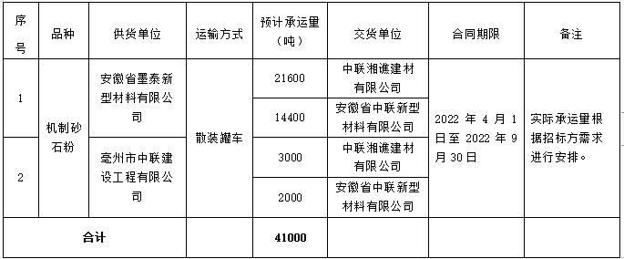 為做好2022年4-9月份安徽墨泰和亳州中聯(lián)機(jī)制砂石粉至安徽中聯(lián)、中聯(lián)湘譙短倒運(yùn)輸招標(biāo)工作,由安徽海螺綠色新材料有限公司采購(gòu)部牽頭,對(duì)上述線路運(yùn)輸進(jìn)行公開招標(biāo),特將本次招投標(biāo)的有關(guān)事宜公告如下: