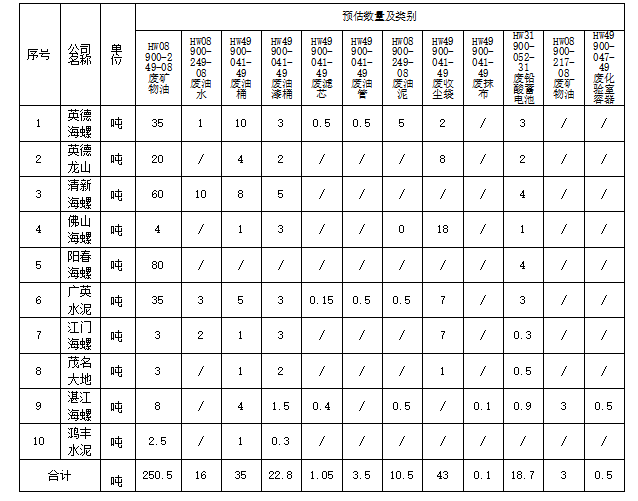 為做好廣東區(qū)域英德海螺水泥有限責(zé)任公司(以下簡稱英德海螺)、廣東清新水泥有限公司(以下簡稱清新海螺)、江門海螺水泥有限公司(以下簡稱江門海螺)、湛江海螺水泥有限責(zé)任公司(以下簡稱湛江海螺)、佛山海螺水泥有限責(zé)任公司(以下簡稱佛山海螺)、茂名市大地水泥有限公司(以下簡稱茂名大地)、陽春海螺水泥有限責(zé)任公司(以下簡稱陽春海螺)、廣東清遠(yuǎn)廣英水泥有限公司(以下簡稱廣英水泥)、廣東海螺鴻豐水泥有限公司(以下簡稱鴻豐水泥)以及英德龍山水泥有限責(zé)任公司(以下簡稱英德龍山)2022-2023年危廢處置工作,防范環(huán)?;轱L(fēng)險(xiǎn),本次由江門海螺牽頭對以上10家公司危廢物資處置進(jìn)行公開招標(biāo),歡迎具備條件的單位參加。現(xiàn)將招標(biāo)基本信息發(fā)布如下: