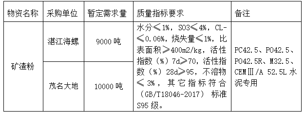 按照廣東區(qū)域供應(yīng)專業(yè)組2022年招標(biāo)計劃安排,安徽海螺水泥股份有限公司廣東區(qū)域下屬的湛江海螺、茂名大地公司2022年2季度礦渣粉聯(lián)合公開招標(biāo)因首次公示不足三家,按招標(biāo)方案現(xiàn)進(jìn)行二次招標(biāo)公示,為進(jìn)一步體現(xiàn)公平、公正、公開的原則,拓寬采購渠道,提高采購質(zhì)量,現(xiàn)將相關(guān)事宜公告如下:
