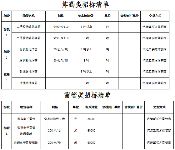1.招標(biāo)物資名稱:招標(biāo)物資名稱:火工材料(膠狀乳化炸藥、改性銨油炸藥、粉狀乳化炸藥、工業(yè)雷管及導(dǎo)爆管)。