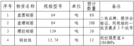3.本次招標(biāo)要求投標(biāo)人公司經(jīng)營(yíng)范圍需涵蓋鋼材、金屬材料、預(yù)應(yīng)力鋼絞線生產(chǎn)或銷(xiāo)售資質(zhì),具備獨(dú)立承擔(dān)民事責(zé)任能力。