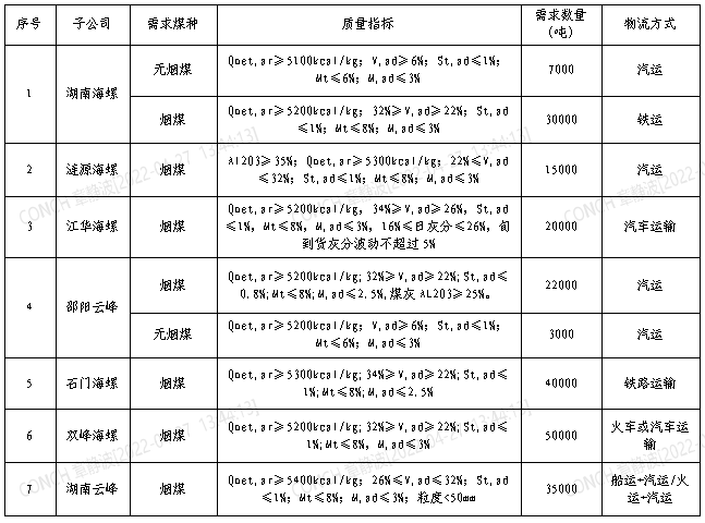 根據(jù)2022年5月21日-2022年6月20日海螺水泥湖南區(qū)域各子公司煤炭需求,現(xiàn)擬對煤炭進(jìn)行公開招標(biāo),選定中標(biāo)人,為體現(xiàn)公平、公正、公開的原則,拓寬采購渠道,現(xiàn)將招標(biāo)相關(guān)事宜公告如下: