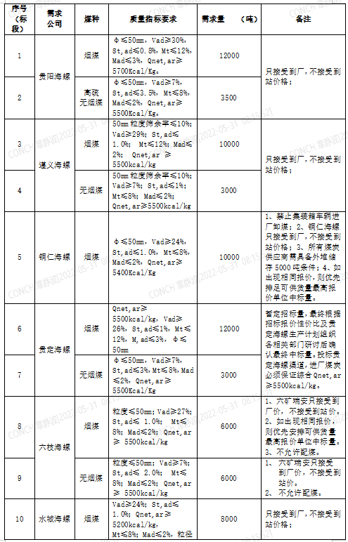 海螺水泥貴州區(qū)域擬對(duì)2022年6月21日至2022年7月20日生產(chǎn)用煤炭進(jìn)行公開招標(biāo),選定中標(biāo)單位,現(xiàn)將相關(guān)招標(biāo)事宜公示如下: