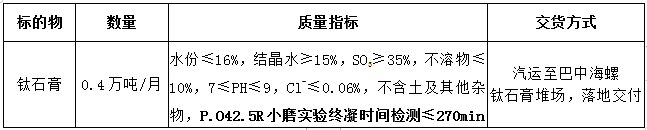 2.報(bào)名渠道需提供鈦石膏貨源地證明材料(包括但不限于合同、發(fā)票等),且新渠道需經(jīng)招標(biāo)人實(shí)地調(diào)研取樣化驗(yàn)合格后方可參與投標(biāo),除化學(xué)指標(biāo)外,招標(biāo)人需要對(duì)新渠道鈦石膏凝結(jié)時(shí)間進(jìn)行檢測(cè),要求在PO42.5R小磨實(shí)驗(yàn)中終凝時(shí)間不高于270min。
