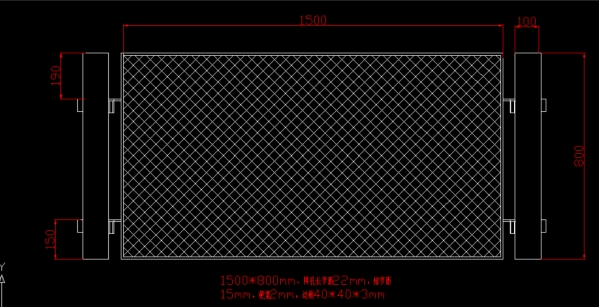 長*寬1500*800mm,網孔長節(jié)距22mm,短節(jié)距15mm,梗寬2mm,邊框角鐵40*40*3mm |