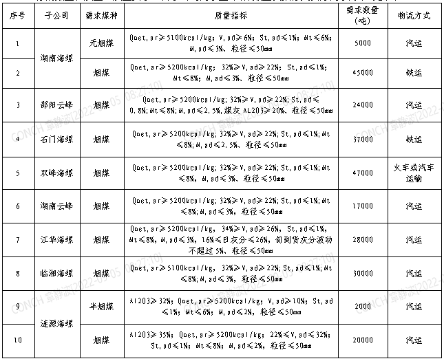 根據(jù)2022年9月21日-2022年10月20日海螺水泥湖南區(qū)域各子公司煤炭需求,現(xiàn)擬對煤炭進行公開招標,選定中標人,為體現(xiàn)公平、公正、公開的原則,拓寬采購渠道,現(xiàn)將招標相關事宜公告如下: