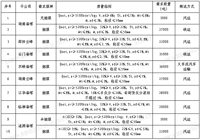 根據(jù)2022年10月21日-2022年11月20日海螺水泥湖南區(qū)域各子公司煤炭需求,現(xiàn)擬對(duì)煤炭進(jìn)行公開(kāi)招標(biāo),選定中標(biāo)人,為體現(xiàn)公平、公正、公開(kāi)的原則,拓寬采購(gòu)渠道,現(xiàn)將招標(biāo)相關(guān)事宜公告如下: