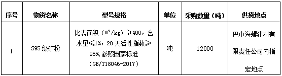 為進一步提升S95級礦粉采購招標的公平、公正、公開透明性,根據(jù)巴中海螺建材(商混)生產(chǎn)礦砂礦粉需求情況,現(xiàn)組織開展S95級礦粉公開招標,特將招標事宜公告如下: