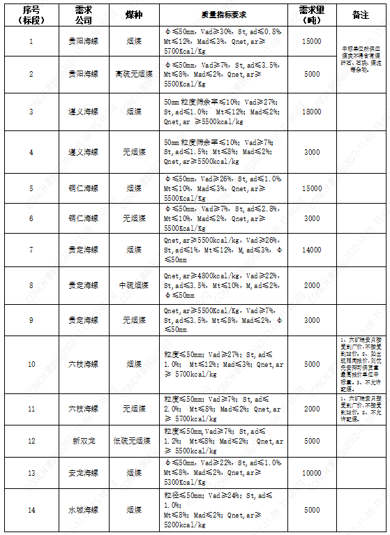 海螺水泥貴州區(qū)域擬對(duì)2022年11月21日至2022年12月20日生產(chǎn)用煤炭進(jìn)行公開招標(biāo),選定中標(biāo)單位,現(xiàn)將相關(guān)招標(biāo)事宜公示如下: