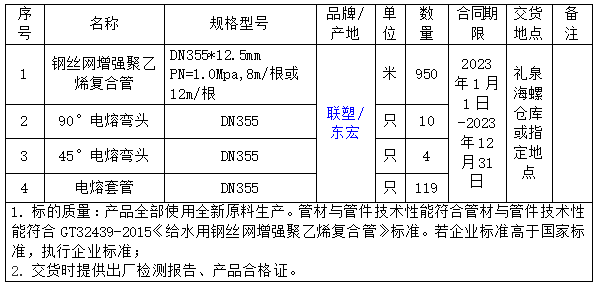 為進一步優(yōu)化拓展供應(yīng)渠道,降低采購成本,規(guī)范采購行為,提高采購效率,本著公開、公平、公正、透明的原則,擬開展鋼絲網(wǎng)增強聚乙烯復(fù)合管及配件招標(biāo)采購工作,擇優(yōu)選擇供應(yīng)商,現(xiàn)將招標(biāo)基本信息發(fā)布如下: