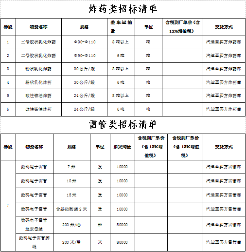 1.招標物資名稱:火工材料(膠狀乳化炸藥、改性銨油炸藥、粉狀乳化炸藥、工業(yè)雷管及導(dǎo)爆管)。