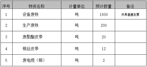 備注:(1)因設(shè)備廢鐵為我公司綜合技改拆卸設(shè)備,中標(biāo)人需安排運(yùn)輸車(chē)輛現(xiàn)場(chǎng)配合及時(shí)倒運(yùn),技改現(xiàn)場(chǎng)無(wú)場(chǎng)地進(jìn)行存放。(2)中標(biāo)人需自備切割工具、吊車(chē)、鏟車(chē)、液力設(shè)備、運(yùn)輸車(chē)輛、裝車(chē)設(shè)備等,清理場(chǎng)地垃圾等費(fèi)用包含在投標(biāo)報(bào)價(jià)內(nèi)。