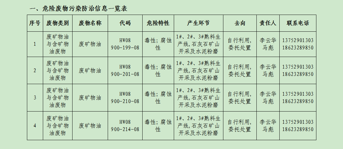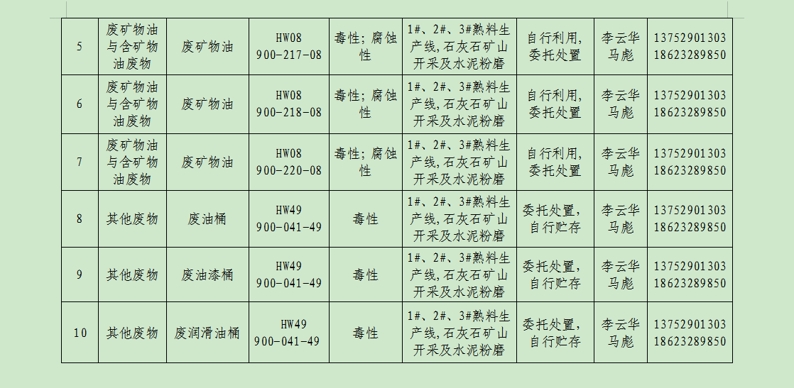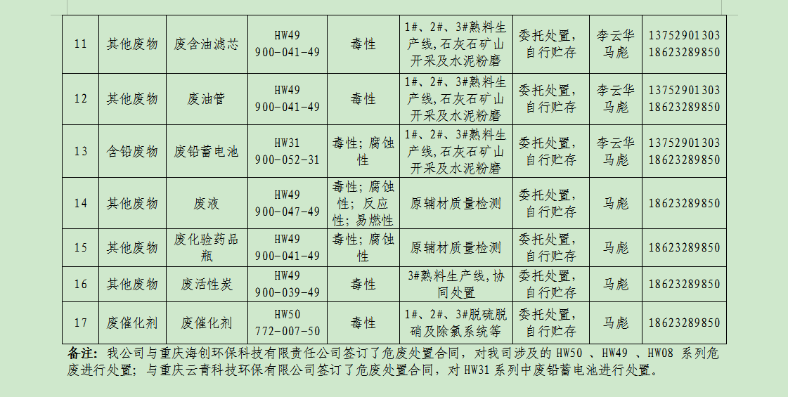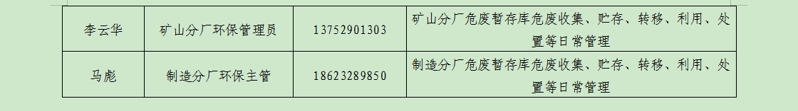 廢棄物的產(chǎn)生單位及管理:礦山分廠由俸云龍負責(zé)管理,負責(zé)督促員工把產(chǎn)生的危廢分類定期送危廢庫暫存,危廢庫由維修工段工段長負責(zé),負責(zé)收集并記錄危廢臺賬;主廠區(qū)由易軍負責(zé)管理,負責(zé)督促員工把產(chǎn)生的廢分類定期送危廢庫暫存,危廢庫由環(huán)保主管馬彪負責(zé),負責(zé)收集并記錄危廢臺賬。危廢庫危廢定期聯(lián)系重慶海創(chuàng)環(huán)??萍加邢挢?zé)任公司、重慶云青環(huán)保科技有限公司等有資質(zhì)公司回收處理并完善相應(yīng)危廢聯(lián)單。