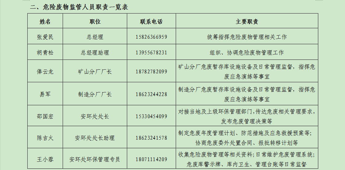 6.三大分廠負責(zé)危險廢物的集中、收集、轉(zhuǎn)貯、防止損失加重。安全環(huán)保處與政府相關(guān)安全、環(huán)保、衛(wèi)生等部門協(xié)助協(xié)調(diào)。