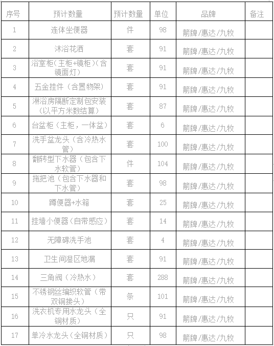 1.標(biāo)的內(nèi)容:衛(wèi)浴材料,具體名稱、規(guī)格及數(shù)量等以招標(biāo)文件清單約定為準(zhǔn),產(chǎn)品質(zhì)量需達(dá)到投標(biāo)品牌對應(yīng)質(zhì)保要求,施工結(jié)束有剩余,若包裝完好不影響二次銷售的需接受退貨。