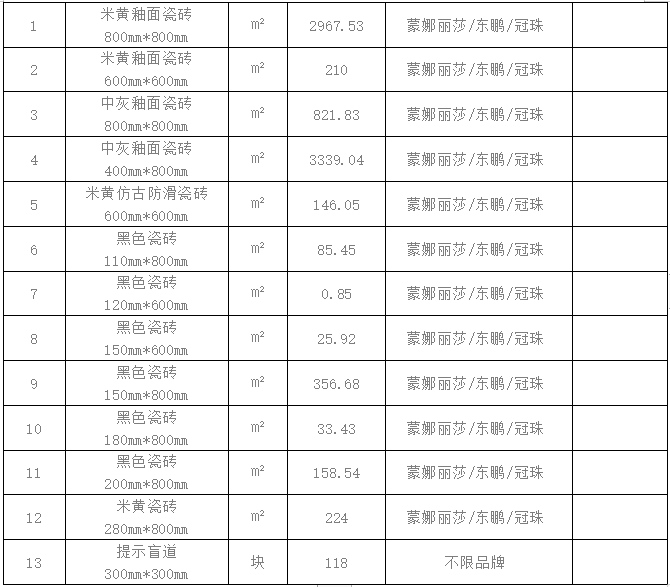 1.標(biāo)的內(nèi)容:瓷磚,具體名稱、規(guī)格及數(shù)量等以招標(biāo)文件清單約定為準(zhǔn),產(chǎn)品質(zhì)量需達(dá)到投標(biāo)品牌對(duì)應(yīng)質(zhì)保要求,施工結(jié)束有剩余,若包裝完好不影響二次銷售的需接受退貨。