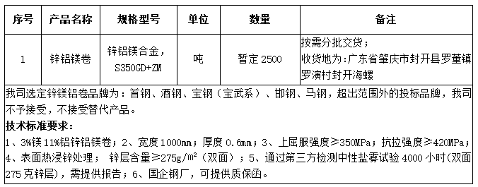 1、招標(biāo)物資信息:宣城海螺建筑光伏公司2023年12月-2024年2月生產(chǎn)用鋅鎂鋁卷(根據(jù)項(xiàng)目結(jié)束時(shí)間)。