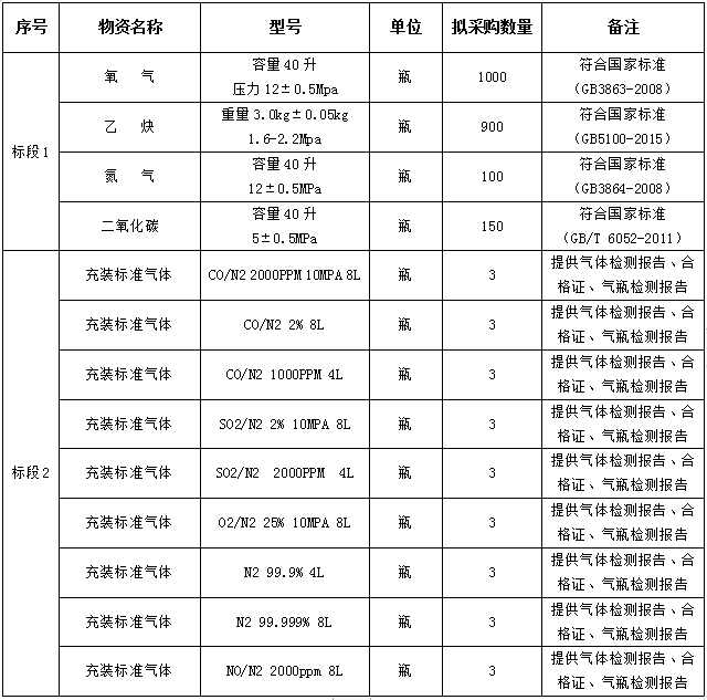 1.招標物資名稱:工業(yè)氣體(氧氣、乙炔、氮氣、二氧化碳、標準氣體)。