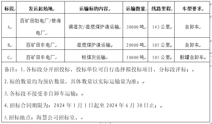 隆安海螺水泥有限責(zé)任公司擬委托安徽海慧供應(yīng)鏈科技有限公司對(duì)百礦集團(tuán)旗下百礦田陽(yáng)電廠/銀海電廠、田東電廠相關(guān)副產(chǎn)品運(yùn)輸線路進(jìn)行公開(kāi)招標(biāo),選定中標(biāo)人?,F(xiàn)將相關(guān)事宜公告如下: