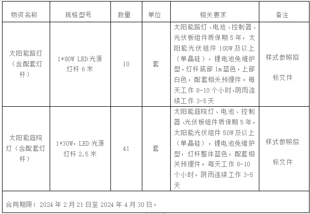 肇慶交投綠色石場有限公司簡稱“德慶海螺”,擬對加工區(qū)辦公樓、宿舍樓區(qū)域太陽能路燈、庭院燈進行公開招標采購,為進一步體現(xiàn)公開、公平、公正、擇優(yōu)的原則,拓寬采購渠道,保證采購質(zhì)量,現(xiàn)將招標采購信息發(fā)布如下: