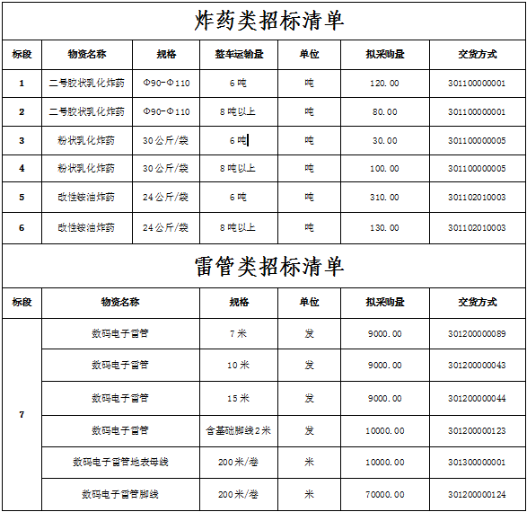 1.招標(biāo)物資名稱:膠狀乳化炸藥、粉狀乳化炸藥、改性銨油炸藥、工業(yè)雷管及導(dǎo)爆管。