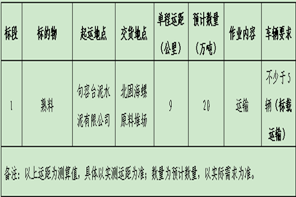 北固海螺擬委托安徽?;酃?yīng)鏈科技有限公司對(duì)句容臺(tái)泥熟料運(yùn)輸項(xiàng)目進(jìn)行公開招標(biāo),選定中標(biāo)人?,F(xiàn)將相關(guān)事宜公告如下: