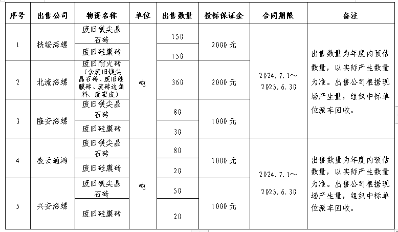 為規(guī)范區(qū)域內(nèi)各公司自動(dòng)插袋包裝機(jī)所用自動(dòng)袋外包裝紙盒(簡(jiǎn)稱:廢紙盒)、廢舊耐火磚出售管理,保證廢紙盒、廢舊耐火磚出售過(guò)程的公開、公平、公正,擬開展廣西區(qū)域2024-2025年度廢紙盒、廢舊耐火磚出售招標(biāo)工作,現(xiàn)將招標(biāo)信息公示如下: