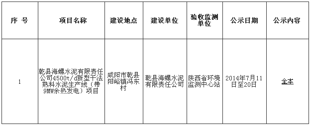 根據(jù)建設(shè)項(xiàng)目竣工環(huán)境保護(hù)驗(yàn)收管理有關(guān)規(guī)定,現(xiàn)將關(guān)于乾縣海螺水泥有限責(zé)任公司4500t/d新型干法熟料水泥生產(chǎn)線(帶9MW余熱發(fā)電)項(xiàng)目竣工環(huán)境保護(hù)驗(yàn)收監(jiān)測(cè)報(bào)告(全本)予以公示,公示期為2014年7月11日-2014年7月20日。公眾可以以信函、傳真、電子郵件等方式提交書面意見(jiàn)。