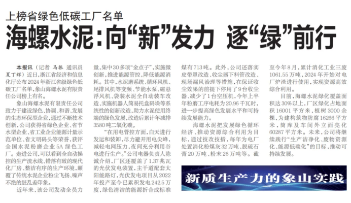 近日,浙江省經(jīng)濟(jì)和信息化廳公布2024年浙江省級綠色低碳工廠名單,象山海螺水泥有限責(zé)任公司榜上有名。