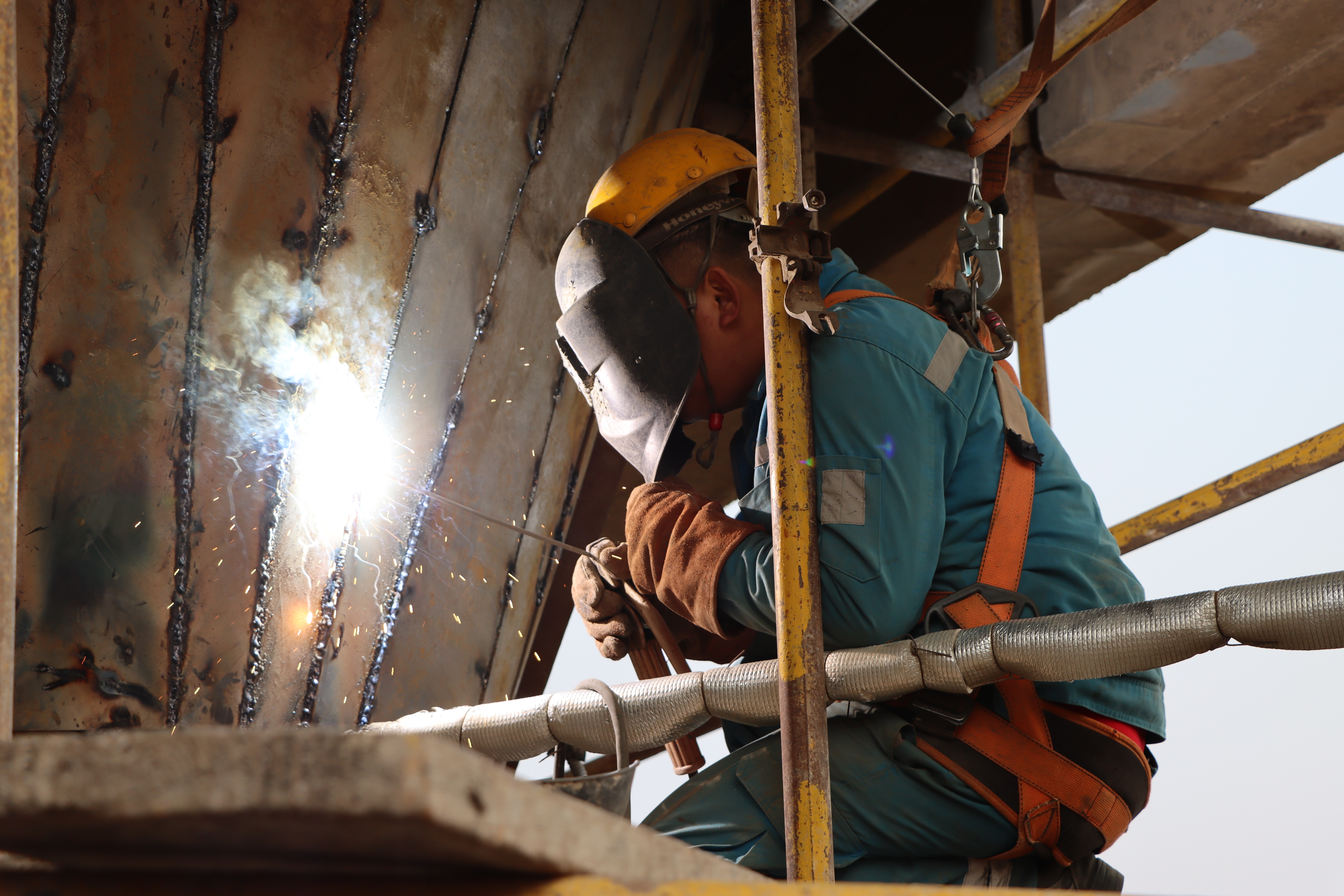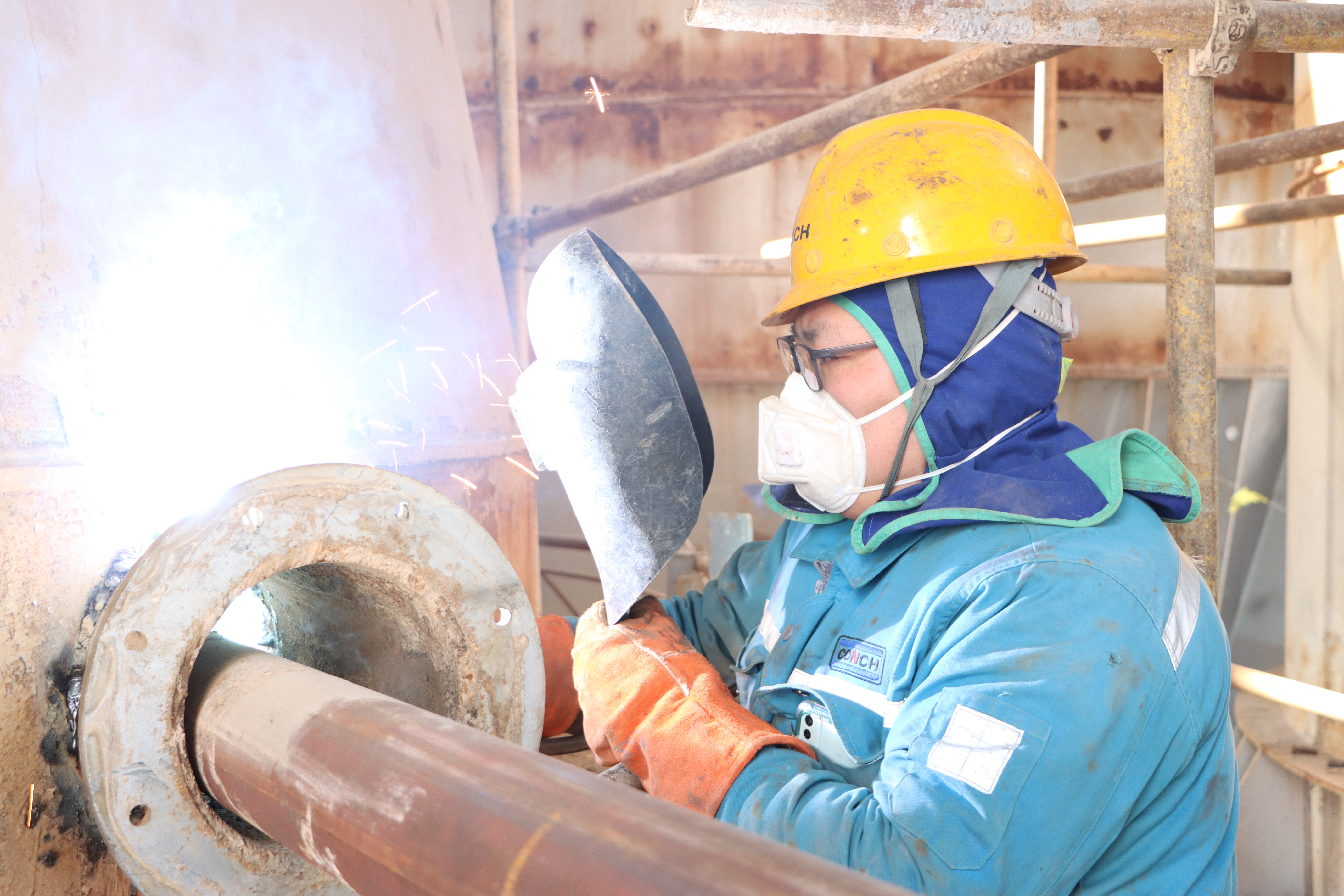 檢修現(xiàn)場冷風(fēng)穿梭,金屬生冷,有這樣一群“焊”衛(wèi)者,他們裹著厚重工裝,雙手在寒風(fēng)中略顯僵硬,卻精準(zhǔn)操控焊槍,電流電壓在專注間調(diào)校妥當(dāng)。正在進(jìn)行分解爐安全防護(hù)層法蘭口焊接的是機(jī)械維修工謝道俊,也是同事心中可愛的“小胖”,飛濺的火花映照著他堅(jiān)毅臉龐,每一次精準(zhǔn)熟練的操作,都是為檢修期間預(yù)熱器系統(tǒng)清理結(jié)皮、澆注料施工等作業(yè)建立的一道安全屏障。