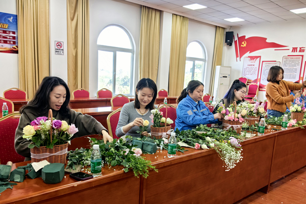 花藝活動(dòng)正式開始,女員工詳細(xì)講解了不同花材的特點(diǎn)及插花的基本技巧,如何根據(jù)花材的高低錯(cuò)落進(jìn)行搭配,怎樣通過(guò)色彩組合營(yíng)造出和諧美感等。實(shí)操環(huán)節(jié)將活動(dòng)推向高潮,她們小心翼翼地修剪花枝,精心構(gòu)思每一朵花的擺放位置,將自己對(duì)美的理解與情感融入其中。有的員工以玫瑰為主花,搭配上幾枝嫩綠的尤加利葉,打造出熱情而不失清新的作品;還有的員工巧妙運(yùn)用坦尼克與滿天星,營(yíng)造出夢(mèng)幻浪漫的氛圍。在創(chuàng)作過(guò)程中,大家相互交流、分享創(chuàng)意,現(xiàn)場(chǎng)歡聲笑語(yǔ)不斷,每一件作品都承載著員工們的獨(dú)特創(chuàng)意與美好期許,它們不再僅僅是一束束鮮花,更是員工們內(nèi)心世界的生動(dòng)表達(dá)。
