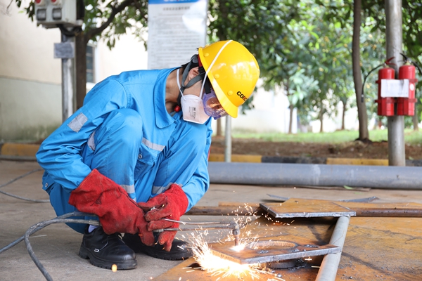 在焊工比賽現(xiàn)場(chǎng),選手們熟練地佩戴著手套、面罩、護(hù)目鏡等防護(hù)裝備,認(rèn)真細(xì)致地打磨器具、焊接過(guò)程流光溢彩,焊花飛舞,如一朵朵絢麗的煙花綻放。