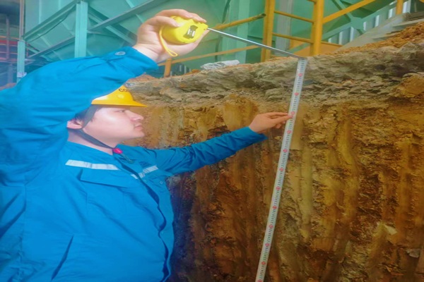 在水泥廠(chǎng)自動(dòng)裝車(chē)車(chē)道地基破除的周邊,TA用心測(cè)量著每個(gè)基礎(chǔ)鋼筋的距離,這處地基挖的孔洞明顯向南偏了20公分,那里的預(yù)埋件明顯傾斜不在水平面,TA指著孔洞以及前面水平儀上的刻度說(shuō),“現(xiàn)在不調(diào)整,等混凝土澆筑后地基不牢固或者偏移過(guò)大就是大問(wèn)題”。