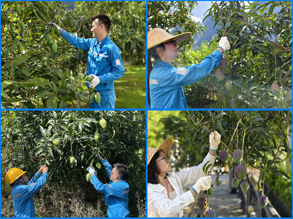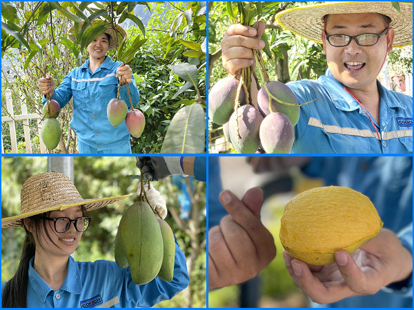 “瞧瞧這大家伙,一個(gè)頂倆!比我的臉還大!”一位員工提起起沉甸甸的金煌芒,笑容如芒果般飽滿。旁邊經(jīng)驗(yàn)豐富的“芒果之鄉(xiāng)”田東縣的同事邊剪邊傳授:“蒂把留一小截,果子更耐放。”新加入的年輕員工起初動(dòng)作略顯生澀,然而幾番嘗試后也漸入佳境,笨拙卻認(rèn)真,汗水混著笑意,映著陽(yáng)光。銷售處的馮姐捧著自己摘下的貴妃芒,嗅著那獨(dú)特的馥郁香氣,不禁感嘆:“這香氣,比賬本上的數(shù)字更令人心甜呢!”