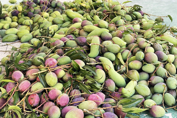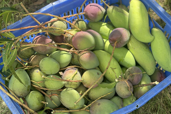 果園內(nèi),各色芒果如同珍寶綴滿枝頭:貴妃芒雍容華貴,金煌芒燦爛輝煌,象牙芒頎長(zhǎng)優(yōu)雅,臺(tái)農(nóng)質(zhì)樸可愛(ài),桂七則散發(fā)著獨(dú)屬于百色土地的濃郁醇香。采摘隊(duì)伍穿梭其間,枝葉間“咔嚓”聲此起彼伏,熟透的果實(shí)應(yīng)聲而落。籃筐漸漸豐盈起來(lái),仿佛裝滿了整個(gè)夏天濃縮的甘甜。有人踮起腳尖小心翼翼,有人架起梯子攀援而上,還有人默契配合,接應(yīng)高處摘下的果實(shí)——人聲與果香交織纏繞,讓果園霎時(shí)成了歡樂(lè)的流動(dòng)盛宴。