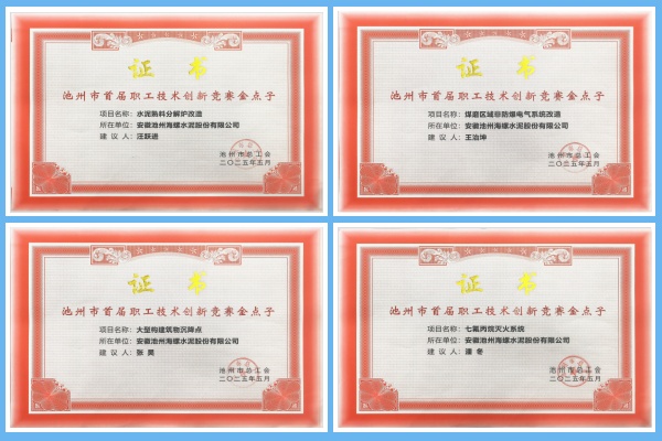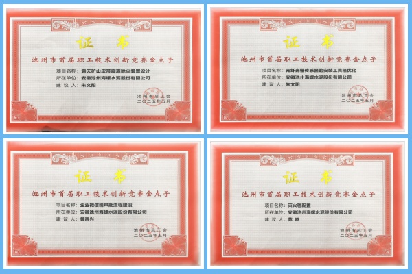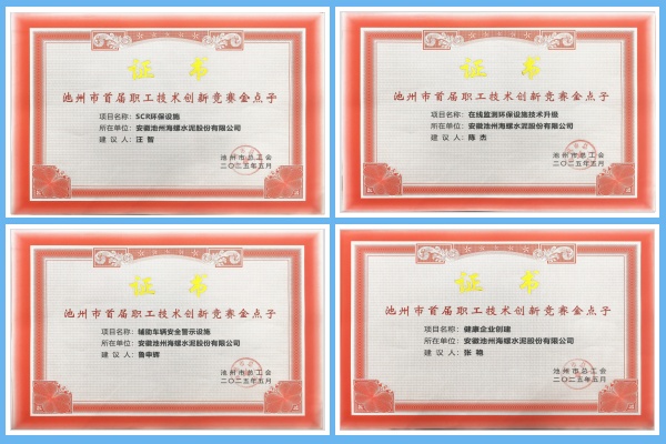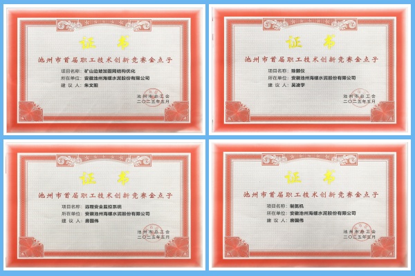 2025年11月,池州海螺榮獲池州市總工會頒發(fā)的多項證書嘉獎,以表彰在池州市首屆職工技術(shù)創(chuàng)新競賽中所取得的優(yōu)異成績。